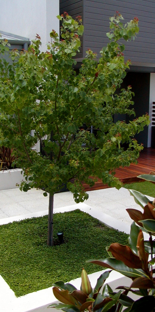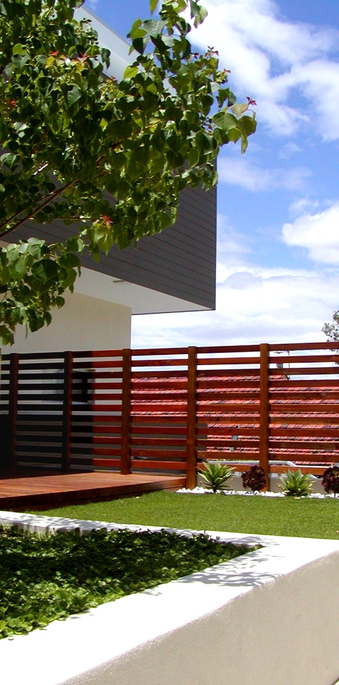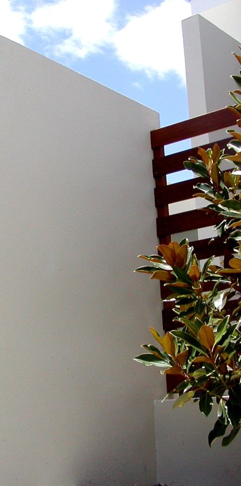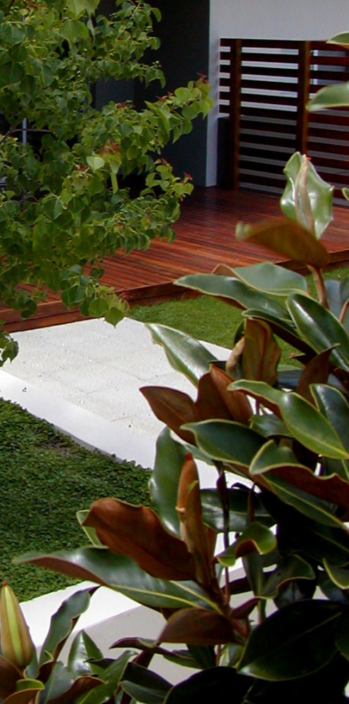The main entertaining area was going to be the front courtyard since it was the larger of the 2. This area accommodated a large deck, lawn and paved area. A raised planter with tree located centrally in the paved area broke up the expanse of paving, creating a shady place to sit and protected the front bedroom from the western sun.
